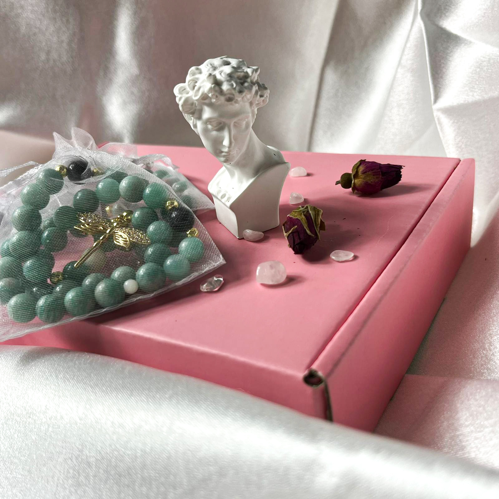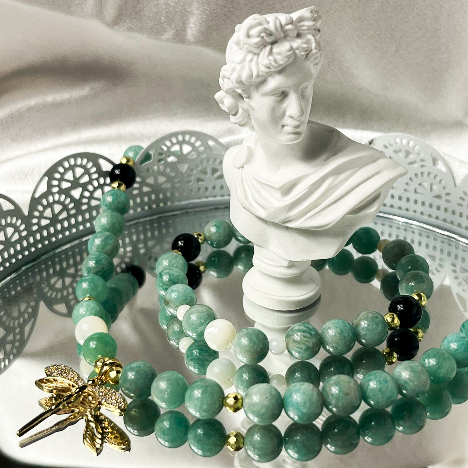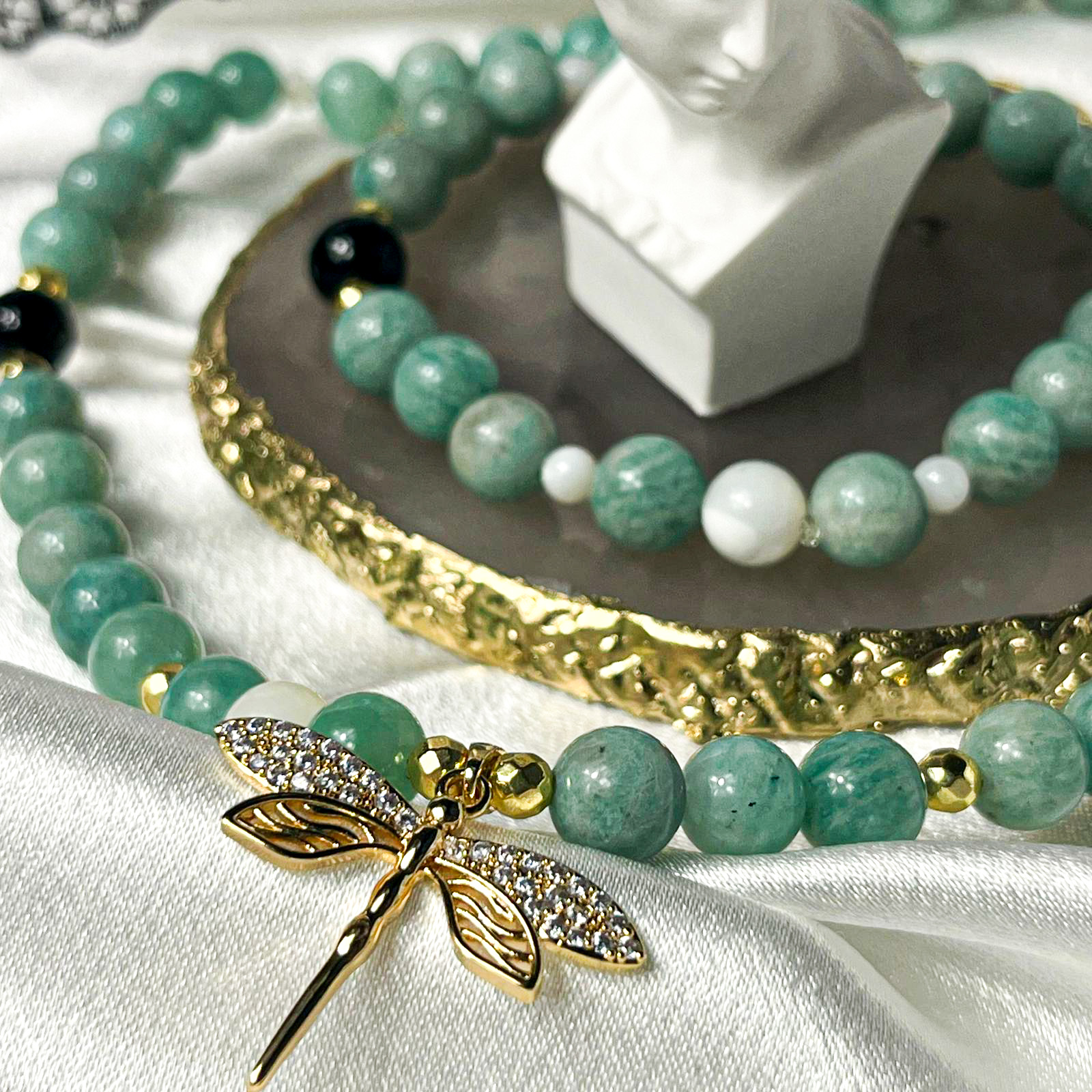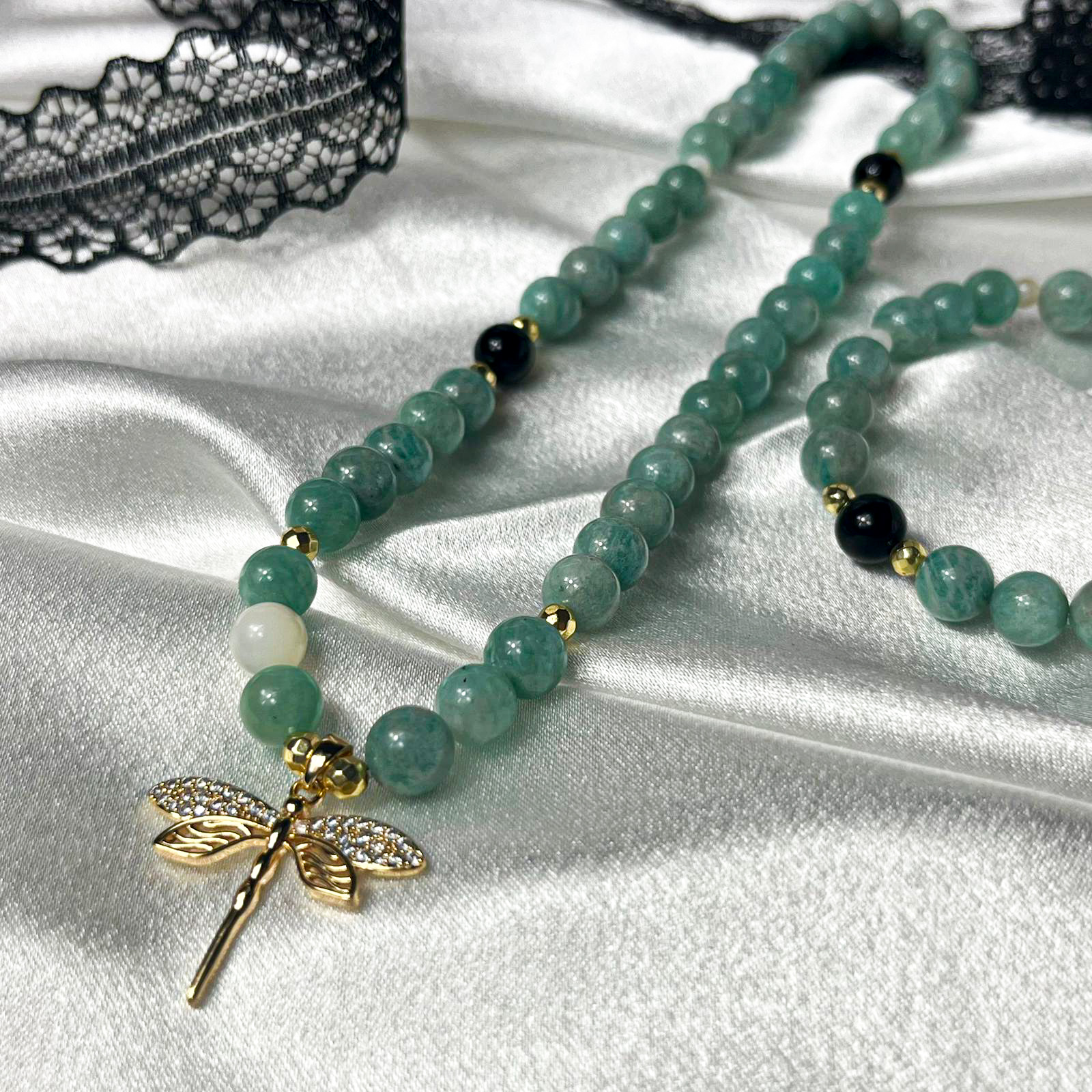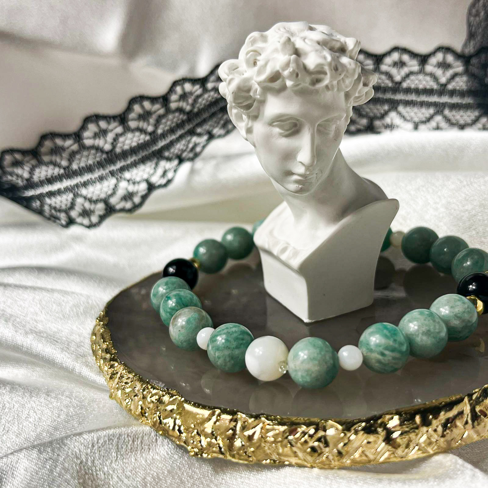 Tato souprava šperků přináší jemný kontrast elegance a vnitřní pevnosti. Kombinace amazonitu, onyxu a perleti je tradičně spojována s nalezením rovnováhy mezi vnitřním klidem, sebejistotou a přirozeným vystupováním. Amazonit je považován za kámen, který symbolizuje upřímnost k sobě, podporuje vyjádření vlastních potřeb a nastavení hranic, zatímco onyx je tradičně spojován s vnitřní stabilitou a symbolizuje udržení pevné půdy pod nohama. Perleť je považována za kámen, který zjemňuje energii celé soupravy a symbolizuje čistotu.