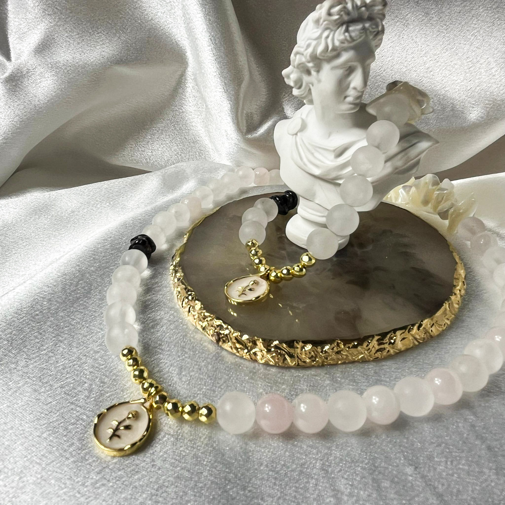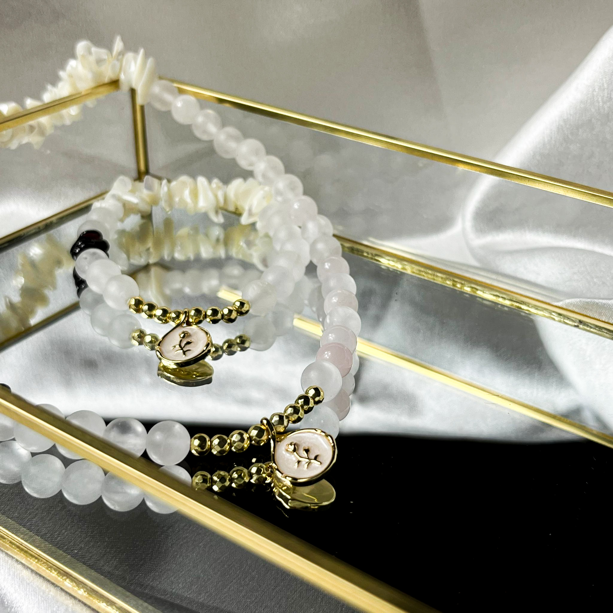 Růženín je považován za kámen, který symbolizuje laskavost a posiluje citlivé vnímání. Pomáhá zachovat laskavost, ale současně udržet zdravé hranice. Perleť je tradičně spojována s čistotou mysli a vnímáním jemných vhledů. Navíc podporuje spontánní inspiraci a vnímání synchronicit.